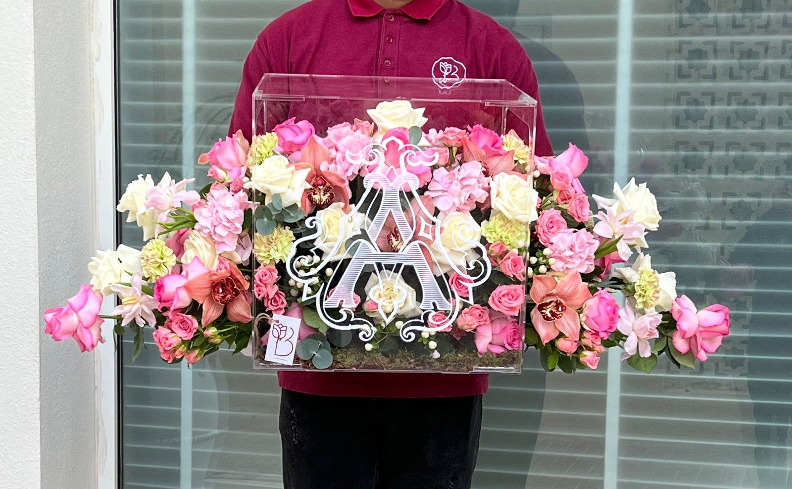 Elegant acrylic floral box filled with premium roses and seasonal flowers.