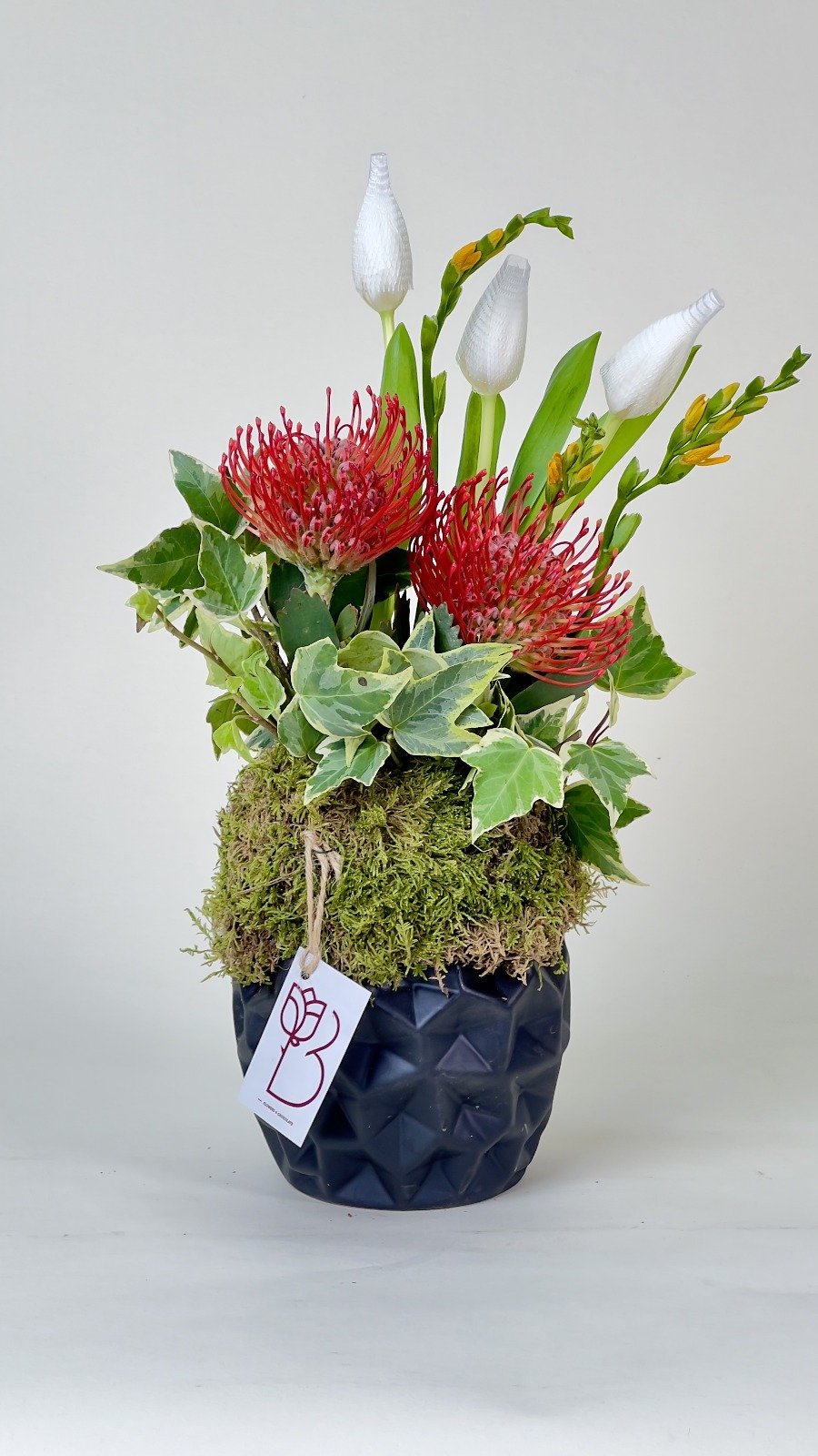Compact centerpiece arrangement with exotic flowers for tables.