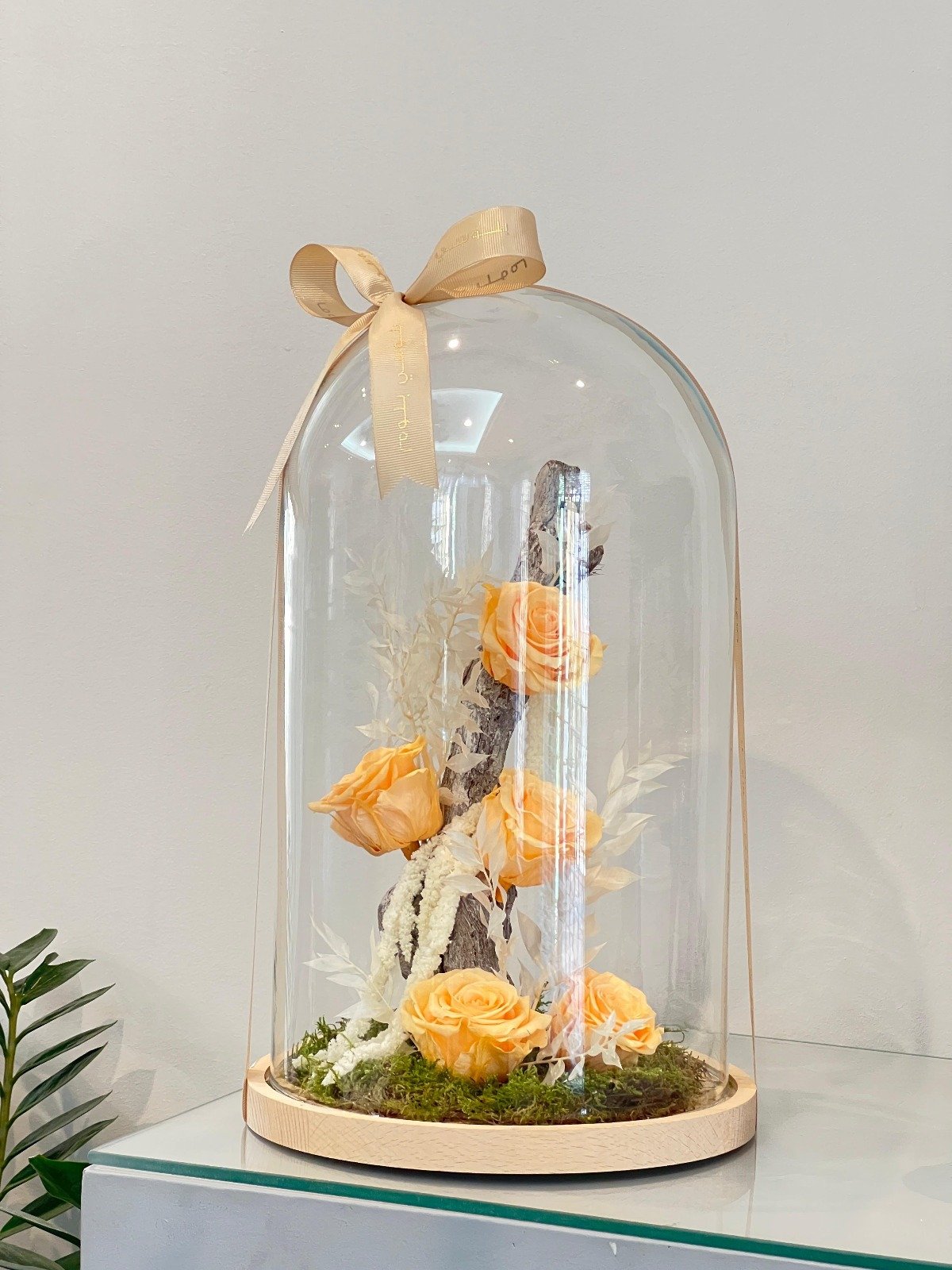 Golden preserved rose under glass dome for a luxury touch.