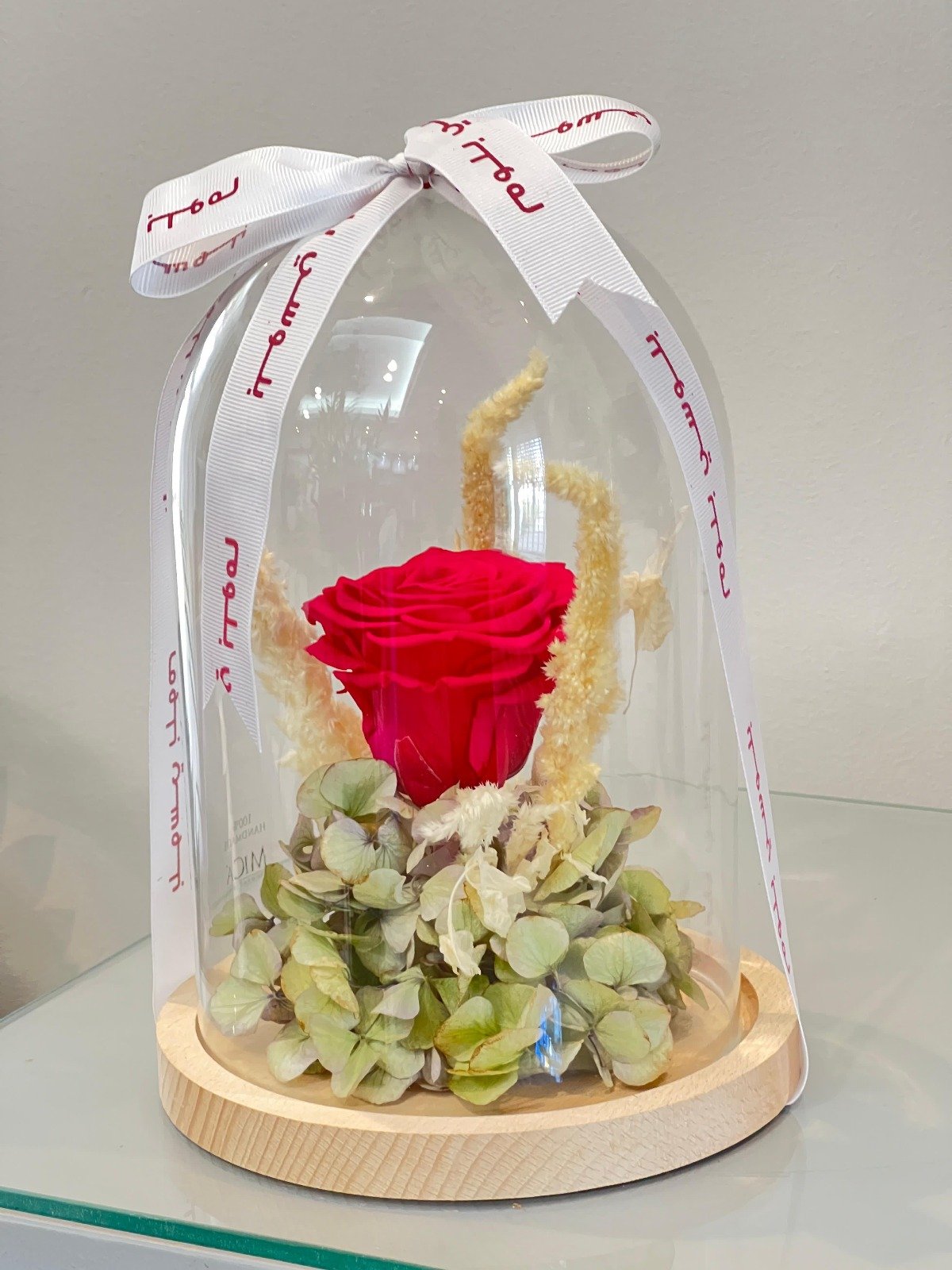 Single preserved red rose under glass dome with base décor.